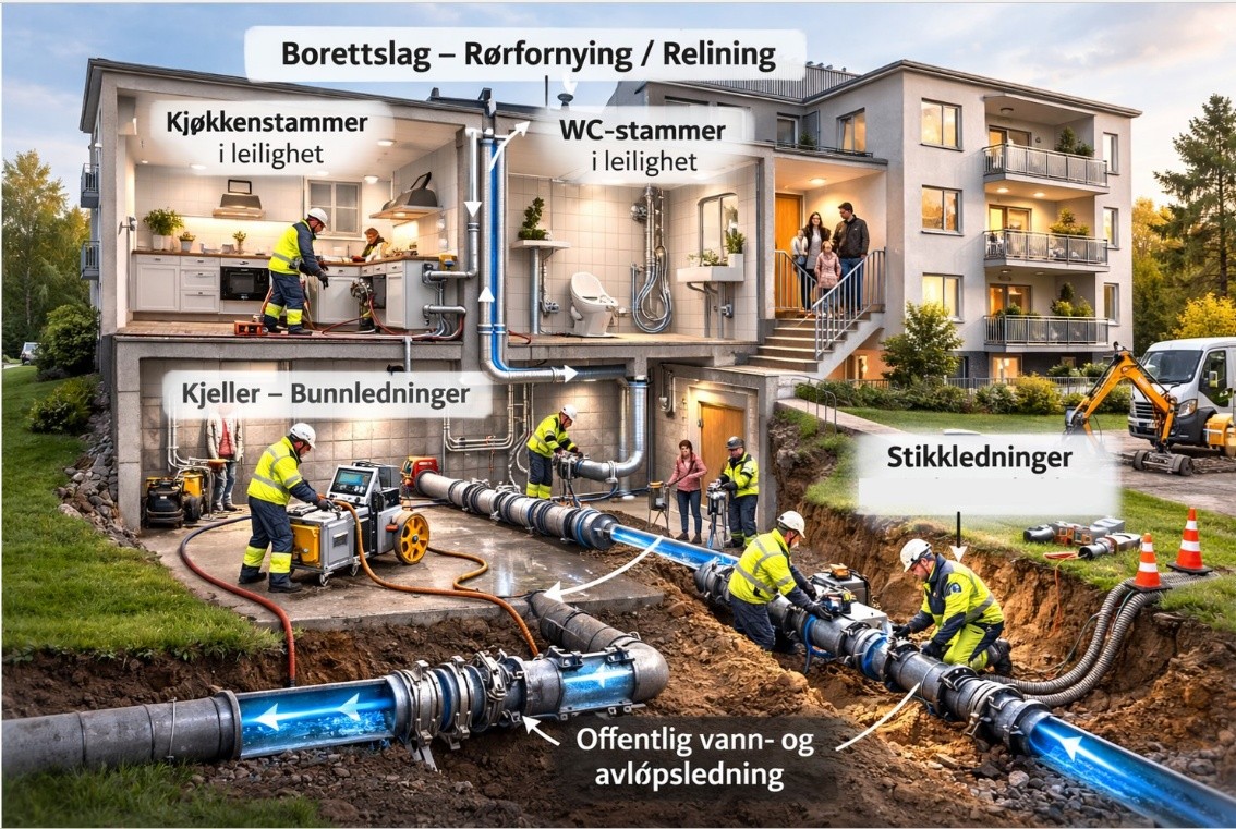 Rørfornying i borettslag presenteres ofte som et kostnadsbesparende og relativt enkelt vedlikeholdstiltak. Samtidig oppstår beslutningen ofte sent – gjerne først når det blir tydelig at rørsystemet nærmer seg slutten av levetiden. Da står styret plutselig overfor en situasjon som kan være krevende: en kombinasjon av tekniske vurderinger, økonomiske beslutninger og hensynet til beboernes hverdag.