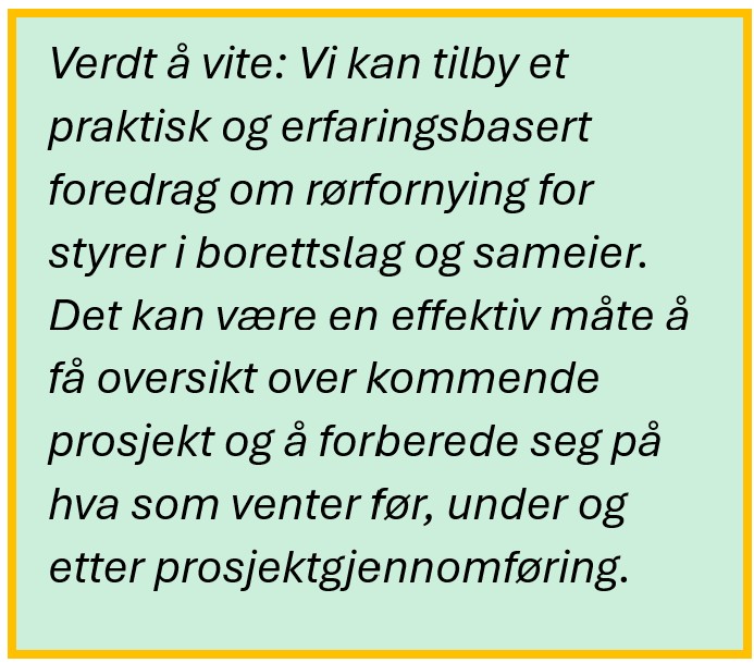 For å forklare hva rørfornying i borettslag og sameier kan omfatte for et besluttende styre, tilbyr vi gjerne et møte om dette. Det kan vise seg at vår erfaring er nyttig.